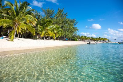 Beautiful views of the resort on the island of Mauritius. Transparent ocean, white sand, palm trees on a background of clouds; Shutterstock ID 399575521
