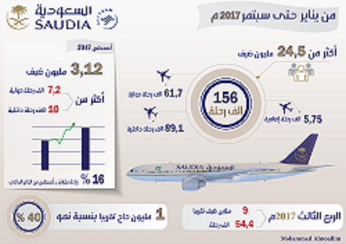 أخبار إقتصادية > الخطوط السعودية تحقق معدَّلات متنامية وتنقل قُرابة تسعة ملايين ضيف في ثلاثة أشهر . > Jan-Sep All