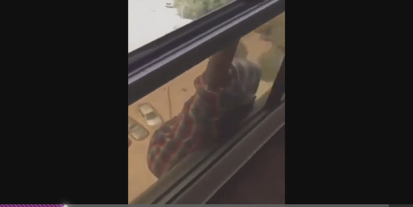 مقطع الفيديو يظهر العاملة المنزلية وهي تتشبث بيدها اليمنى في الفراغ على شرفة المنزل، بينما تتوجه إليها المرأة بالقول “يا مجنونة تعالي” مواصلة تصويرها من دون بذل أي جهد لمساعدتها.
