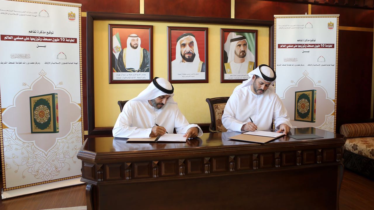 أبرمت الهيئة العامة للشؤون الإسلامية والأوقاف مع مركز محمد بن راشد لطباعة المصحف الشريف مذكرة تفاهم لطباعة 10 ملايين نسخة من المصحف الشريف بجودة عالية ودقة متناهية والتي تميز بها المركز عالميا، وذلك تفاعلا مع مبادرة “عام الخير” التي أطلقها صاحب السمو الشيخ خليفة بن زايد آل نهيان، رئيس الدولة ـ حفظه الله.