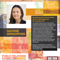 و قامت السيدة جايان جريجوريان، مديرة ادارة العلاقات العامة و الاتصالات في ايريس ميديا بالمشاركة في المؤتمر السنوي، حيث تحدثت عن مكانة و تأثير العلاقات العامة الرقمية و استخدامها في السوق الاماراتي و الخليجي.