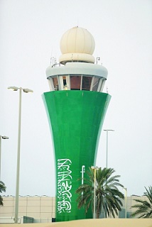 برج المراقبة في مطار أبوظبي الدولي يتزين بعلم المملكة العربية السعودية وذلك في إطار احتفالات دولة الإمارات بمناسبة اليوم الوطني السعودي الـ 87 الذي يصادف 23 سبتمبر الجاري .