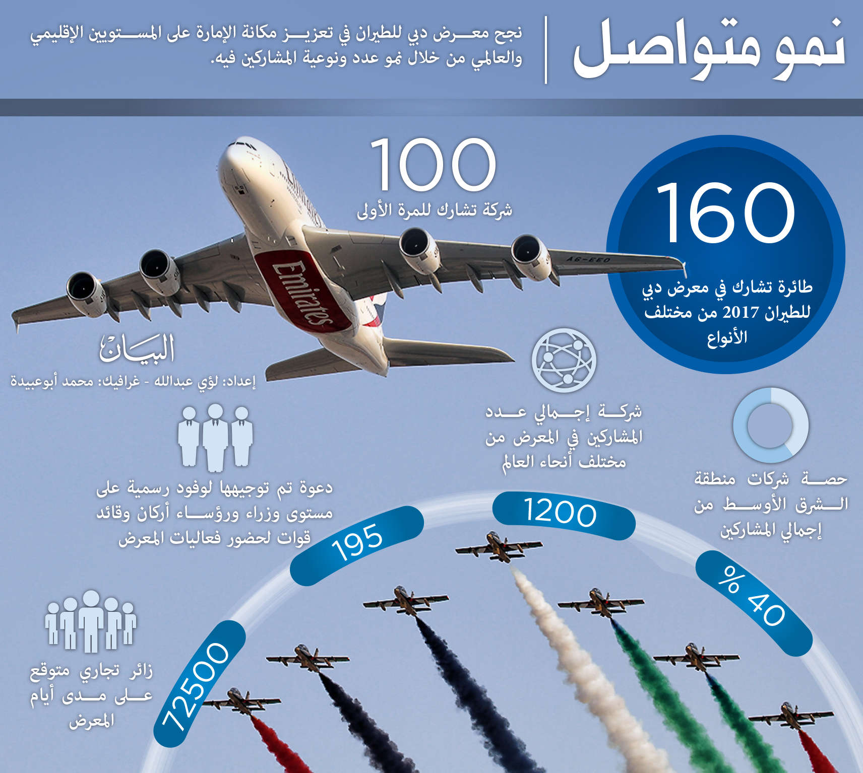 تنطلق فعاليات معرض دبي للطيران 2017 في 12 نوفمبر المقبل، بمشاركة أكثر من 1200 شركة بنمو 8.8% مقارنة بالدورة السابقة منها نحو 100 شركة تشارك للمرة الأولى، ومن المتوقع أن يصل عدد الزوار إلى 72.5 ألف زائر تجاري.