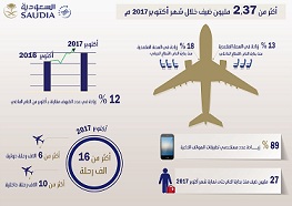 ونوَّه مدير عام الخطوط الجوِّية العربية السعودية الـمهندس صالح بن ناصر الجاسر بنُمو العمليَّات التشغيلية لـ”السعودية” وتحقيق معدَّلات مرتفعة في عدد الضيوف على متن رحلاتها خلال شهر اكتوبر من هذا العام أو على مدى الأشهر العشرة الـماضية ، وقال :”تحقيق الـمعدَّلات الـمتنامية في أرقام الأداء التشغيلي خلال شهر اكتوبر ، وكذلك تنامي العمليَّات التشغيلية منذ بداية العام سواء الرحلات المجدولة على القطاعين الداخلي والدولي وكذلك رحلات الحج، كل ذلك يعكس النُمو الشامل الذي تشهده الـمؤسسة وشركاتها ووُحداتها الاستراتيجية في إطار برنامج التحول الذي يجري تنفيذه في المؤسسة وشركاتها ووحداتها الاستراتيجية متَّسقاً مع برنامج التحوُّل الوطني وقد أثمرت مبادرات برنامج التحوُّل والخطة الاستراتيجية (SV2020) المتعلقة بالاستثمار الأمثل للأسطول وتحديثه وتنميته في زيادة السعة المقعدية خلال العام الجاري بنسبة (13%) على القطاع الداخلي و (18%) على القطاع الدولي ، ونتج عن زيادة السعة المقعدية نمواً في أعداد الضيوف وتحقيق المعدلات المتنامية في الأداء التشغيلي بشكل عام” .