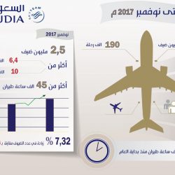 حققت الخطوط السعودية نمواً جديداً في أدائها التشغيلي خلال شهر نوفمبر 2017م مقارنة بنفس الشهر من العام الماضي، وسجلت معدّلات متنامية في السعة المقعدية المتوفرة وأعدد الرحلات وأعداد الضيوف على القطاعين الداخلي والدولي، وأظهر تقرير الأداء التشغيلي لشركة الخطوط السعودية للنقل الجوِّي لشهر نوفمبر تحقيق نمو في عدد الضيوف بنسبة (7,32%)، حيث تم نقل (2,5) مليون ضيفاً، وارتفع عدد الضيوف الذين نقلتهم “السعودية” من بداية العام إلى (29,5) مليون ضيف.