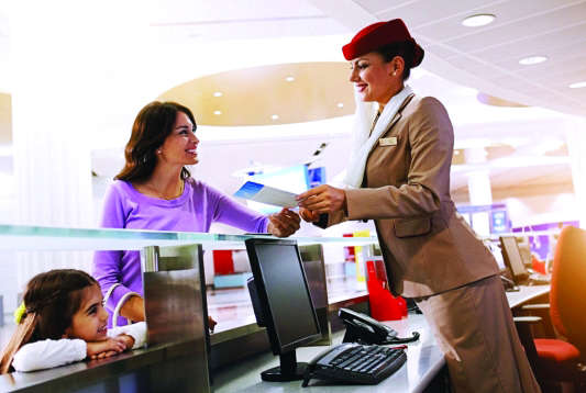 ويمكن للعملاء إنجاز إجراءات سفرهم من أجهزتهم المكتبية أو المحمولة خلال الفترة من 48 ساعة حتى 90 دقيقة قبل موعد مغادرة الرحلة. وتتوفر للعملاء أيضاً إمكانية إنجاز إجراءات سفرهم وتسليم أمتعتهم على 16 كاونتراً ضمن مواقف السيارات خلال 24- 6 ساعات قبل موعد الإقلاع. وينصح الركاب بالالتزام بوزن الأمتعة اليدوية المسموح به، حيث يجب ألا يزيد وزن كل قطعة عن 7 كيلوغرامات للدرجة السياحية و14 كيلوغراماً للدرجتين الأولى ورجال الأعمال.