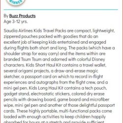وتعمل الخطوط السعودية بشكل متواصل لتطوير منتجاتها وتحسين خدماتها ضمن مبادرات برنامج التحول الذي يجري تنفيذه في المؤسسة وشركاتها ووحداتها الاستراتيجية وتسعى لمواكبة أحدث تقنيات ووسائل الترفيه الجوي للضيوف المسافرين على متن رحلاتها، ومنهم الأطفال الذين توليهم “السعودية” اهتماما خاصا لتكون رحلاتهم ممتعة ومريحة، كما تعتبر هذه الجائزة جزء يسير مما تقدمه الخطوط السعودية لضيوفها الصغار فهناك خدمات أخرى متنوعة كوجبات الأطفال الخاصة وساعات الترفيه عبر المحتوى الترفيهي الجوي إضافة إلى تخصيص أماكن خاصة بالأطفال في صالات الفرسان.