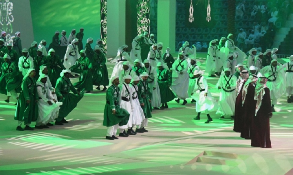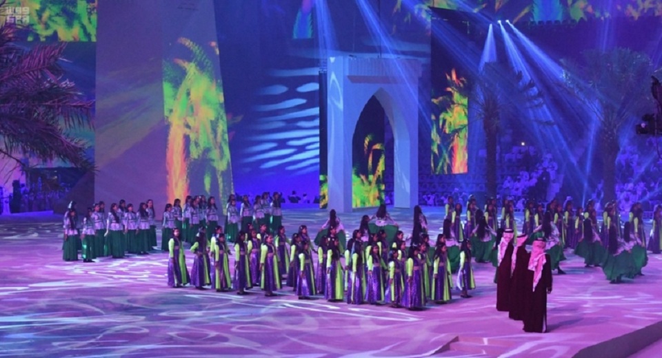 ثم شرف خادم الحرمين الشريفين الملك سلمان بن عبدالعزيز آل سعود – حفظه الله – وضيوف المملكة، الحفل الخطابي والفني الكبير الذي أقيم في القاعة المغلقة في الجنادرية.