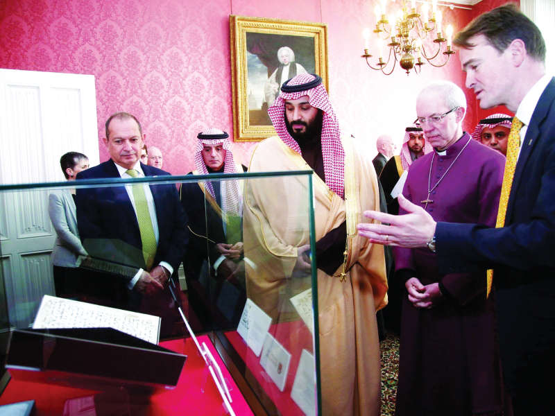 كما التقى في ثاني أيام زيارته إلى العاصمة البريطانية لندن، رئيسة الوزراء، تيريزا ماي، على مأدبة عشاء.وفي مبادرة عبرت عن التسامح والسلام، قال مكتب كبير أساقفة كانتربري رأس الكنيسة الإنجليكانية إن ولي العهد السعودي عقد اجتماعاً مع كبير الأساقفة في لندن أمس، ووعد بالعمل على تعزيز الحوار بين الأديان في إطار إصلاحاته الداخلية.