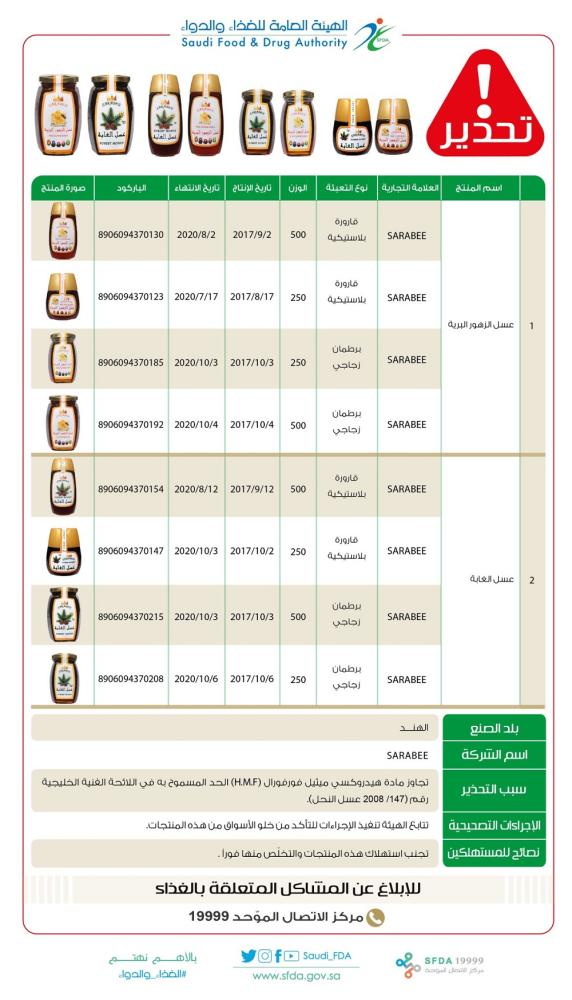 كما أوصت المستهلكين بتجنب استهلاك هذه المنتجات والتخلّص مما لديهم منها فوراً، حفاظاً على صحتهم، مشيرة إلى أنها تتابع تنفيذ الإجراءات اللازمة للتأكد من خلو الأسواق منها. موضحة ذلك بالعلامة التجارية «SARABEE» على شكل الجدول التالي.