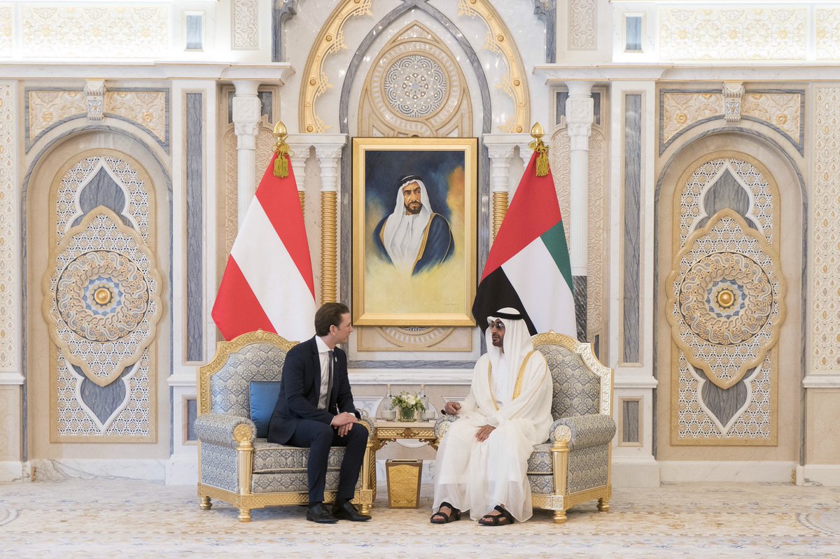 وكان صاحب السمو الشيخ محمد بن زايد آل نهيان ولي عهد أبوظبي نائب القائد الأعلى للقوات المسلحة استقبل في قصر الرئاسة سيباستيان كورتز مستشار جمهورية النمسا الصديقة الذي يقوم بزيارة رسمية إلى الدولة.