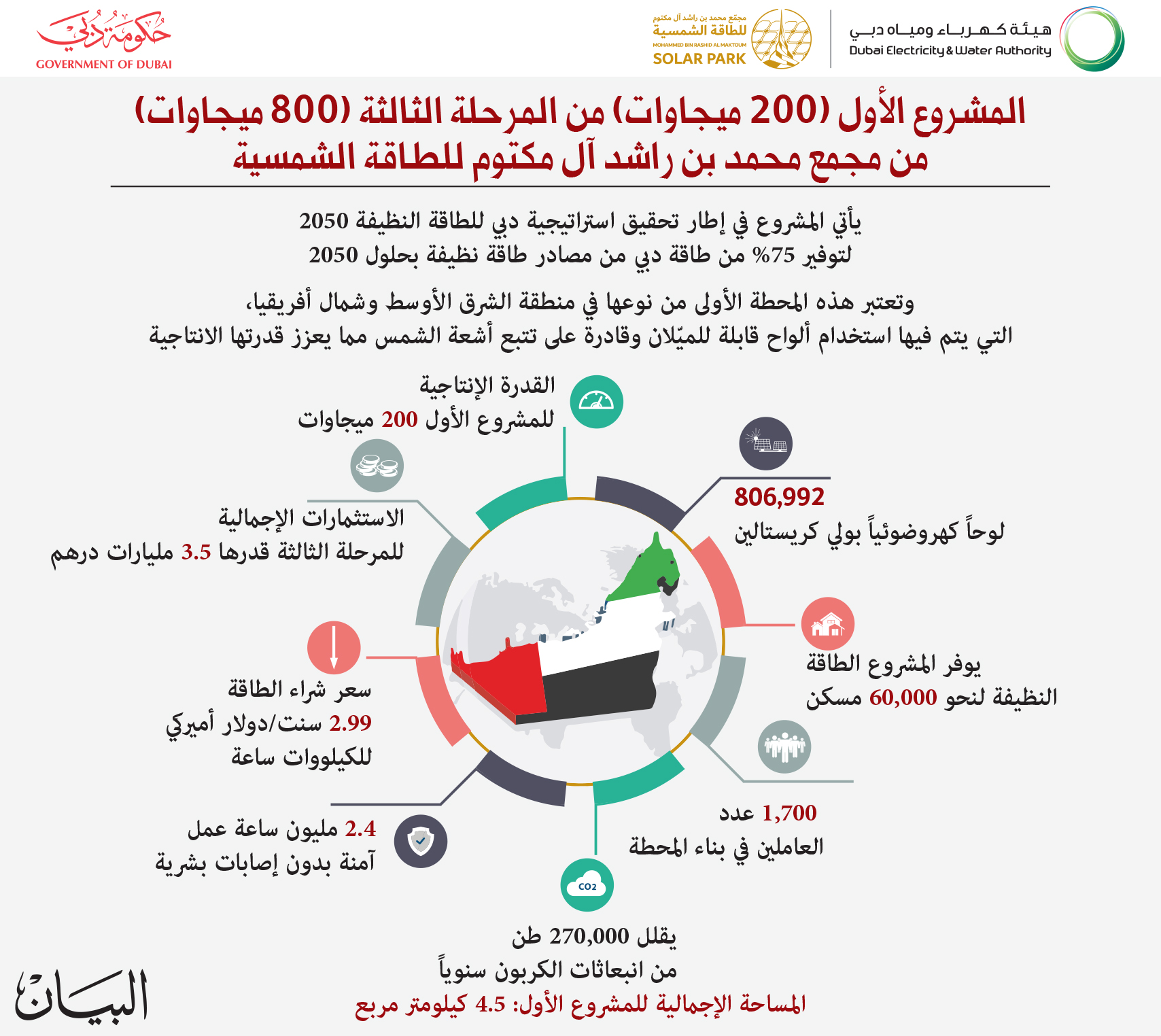 دشّن صاحب السمو الشيخ محمد بن راشد آل مكتوم، نائب رئيس الدولة رئيس مجلس الوزراء حاكم دبي، رعاه الله، المشروع الأول بقدرة 200 ميجاوات ضمن المرحلة الثالثة التي تبلغ قدرتها 800 ميجاوات في «مجمع محمد بن راشد آل مكتوم للطاقة الشمسية».