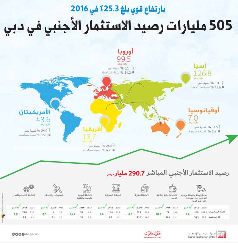 كشف مركز دبي للإحصاء أن رصيد الاستثمار الأجنبي في دبي بلغ 505 مليارات درهم في عام 2016 بارتفاع قدره 25.3% مقارنة بالعام 2015، ما يؤكد المكانة الرائدة للإمارة كإحدى أفضل الوجهات الجاذبة للاستثمارات الأجنبية في المنطقة والعالم، لما تتميز به من فرص نوعية للاستثمار، مدعومة بما تملكه من بنية تحتية متطورة وإطار تشريعي مرن يوفر بيئة داعمة للمستثمرين.