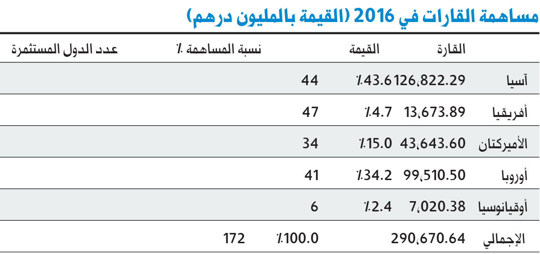 ومن حيث التـــوزيع الجـــغرافي للمستثمرين، شكّلت قارة آسيا المساهم الأكبر في إجمالي رصيد الاستثمار الأجنبي المباشر حيث استحوذ المستثمرون الآسيويون على 43.6% من مجمل رصيد الاستثمار الأجنبي المباشر في العام 2016، وجاءت الهند في مقدمة دول آسيا من حيث المساهمة في النمو المتحقق مساهمة بما نسبته 8.3% برصــيد بلغ 24 مليار درهم وبنمو قدره 10.4%، واحتلت قارة أوروبا المرتبة الثانــية من حيث المساهمة في رصيد الاستثمار الأجنبي المباشر بنسبة 34.2%، ومن حيـــث التوزيع وفقا للدول، فقد جاءت المملكة المتحدة في مقدمة دول أوروبا ودول العالم من حيث المساهمة بنسبة 16% من إجمالي رصيد الاستثمار الأجنبي المباشر برصيد بلغ 46.4 مليار درهم وبمعـــدل نمو بلغ 7.4%، وجاءت في المرتبة الثالثة أميركا الشمالية وأميركا الجنوبية بمساهمة قدرها 15%، فيما احتلت الولايات المتحدة الأميركية المرتبة الأولى من حيث المساهمة بنسبة 5.9% من مجمل الاستثمار الأجنبي المباشر برصيد بلغ 17.2 مليار درهم محققة نموا بنسبة 17.9%، وقد جاءت قارة أفريقيا في المرتبة الرابعة بنسبة 4.7% من مجمل رصيد الاستثمار الأجنبي المباشر، جاءت في المرتبة الخامسة قـــارة أوقــيانوسيا بنسبة 2.4%.