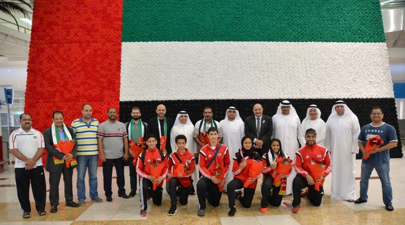 وشارك في استقبال البعثة، المهندس مروان سنكل نائب رئيس اتحاد الكاراتيه ومحمد سعيد بن درويش المدير التنفيذي للجنة الأولمبية الوطنية وحميد شامس الأمين العام المساعد للاتحاد والأمين العام للاتحاد العربي للكاراتيه، والخبير هشام سري السكرتير الفني للاتحاد، وطارق العريدي مسؤول العلاقات العامة والبروتوكول للجنة الأولمبية الوطنية ومحمود السيد محاسب الاتحاد، وعدد من ذوي اللاعبين واللاعبات.