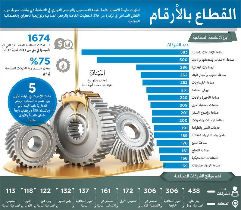 ووفقاً لبيانات خارطة دبي للأعمال الصادرة عن قطاع التسجيل والترخيص التجاري في اقتصادية دبي، شهدت الفترة من 2011 لغاية 2017 تأسيس 1674 شركة صناعية جديدة في الإمارة، وأظهرت البيانات تسلسل نمو حركة تأسيس الشركات العاملة في القطاع الصناعي منذ العام 1963. إذ بلغ عدد الرخص الصناعية الجديدة من 1963 ـ 1970 ما يقارب 39 رخصة.