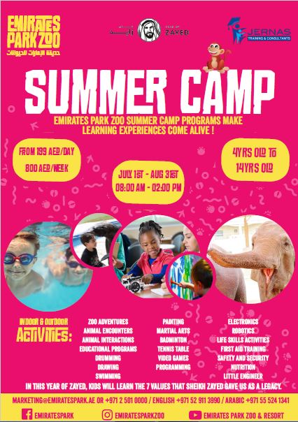 يتضمن هذا المخيم الصيفي المقام بوجهة الضيافة والترفيه الأشهر في العاصمة؛ منتجع وحديقة الإمارات للحيوانات، العديد من الأنشطة الترفيهية والتثقيفية المناسبة للأطفال من عمر 4 سنوات وحتى عمر 14 سنة، والتي تشمل الرياضة، والفنون، والمغامرة، والتفاعل مع الحياة البرية، بالإضافة إلى ألعاب المخيمات الصيفية التقليدية.