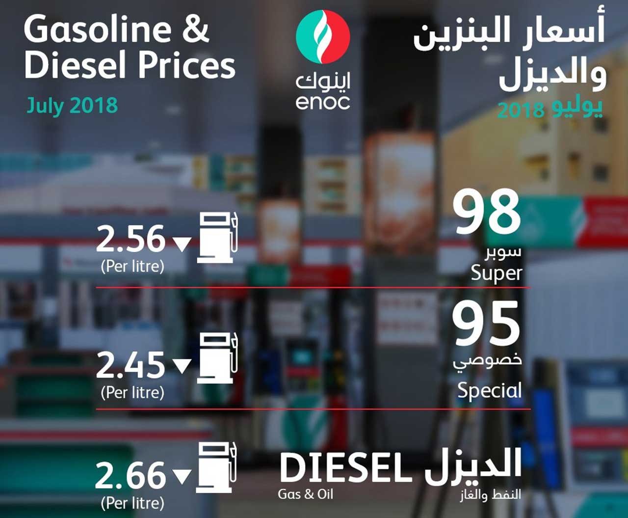 ووفقا للتسعيرة الجديدة، التي يبدأ تطبقها الأحد القادم في جميع محطات التوزيع بالدولة متضمنة ضريبة القيمة المضافة بواقع 5%، ينخفض سعر لتر الغازولين 98 (سوبر) إلى 2.56 درهم، فيما يتراجع لتر الغازولين 95 (خصوصي) إلى 2.45 درهم، وسيبلغ سعر لتر الديزل في الشهر المقبل 2.66 درهم .