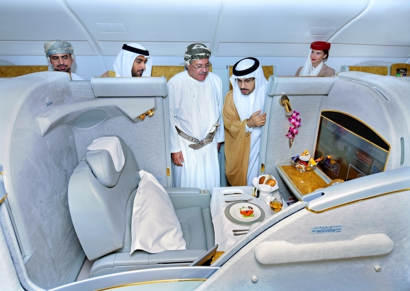 ووصل على متن الطائرة وفد من كبار الشخصيات يتقدمهم الشيخ ماجد المعلا، نائب رئيس أول طيران الإمارات لدائرة العمليات التجارية، ولقيت الطائرة استقبالاً تقليدياً برشاشات المياه. وكان في استقبال الوفد عدد من المسؤولين الحكوميين ومسؤولي المطار وممثلي وسائل الإعلام، الذين قاموا بعد ذلك بجولة داخل الطائرة واستمعوا إلى شرح عن منتجاتها وتجهيزاتها الفريدة. والطائرة مقسمة بتوزيع الدرجات الثلاث: 429 مقعداً مريحاً في الدرجة السياحية في الطابق السفلي، و76 مقعداً يتحول إلى سرير مستو في درجة رجال الأعمال، و14 جناحاً خاصاً في الدرجة الأولى في الطابق العلوي.