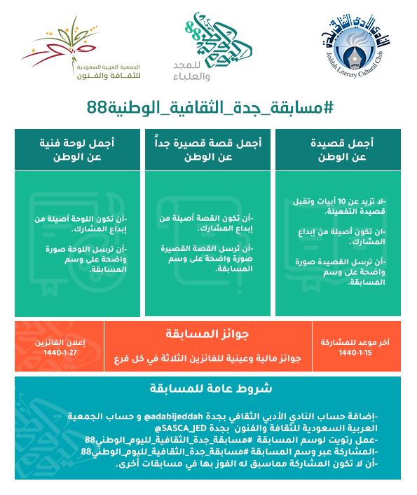 تفاعلاً مع الذكرى الـ (٨٨) لليوم الوطني أعلن النادي الأدبي الثقافي بجدة بالشراكة مع فرع جمعية الثقافة والفنون بجدة عن مسابقة ثقافية على حساب النادي والجمعية في موقع التواصل الاجتماعي «تويتر» عبر وسم المسابقة ( #مسابقة_جدة_الثقافية_لليوم_الوطني88) لتشمل: أفضل قصيدة عن اليوم الوطني حيث لا تزيد عن 10 أبيات وتكون قصيدة تفعيلية. وان تكون من إبداع المتسابق، وترسل القصيدة صورة واضحة على وسم المسابقة.