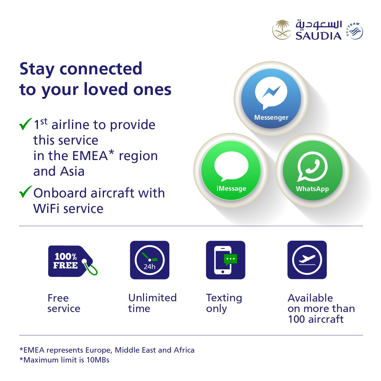 وتتوفر الخدمة لكافة درجات السفر على أكثر من (100) طائرة من طائرات أسطول الخطوط السعودية الحديث المكون من طائرات B777-300 و B787 “دريملاينر” و A330-300 والجيل الجديد من طائرات A320 ، حيث تعتبر “السعودية” أول شركة طيران في أوروبا والشرق الأوسط وأفريقيا وآسيا تقدم خدمة مجانية لتطبيقات التواصل الاجتماعي على الرحلات .