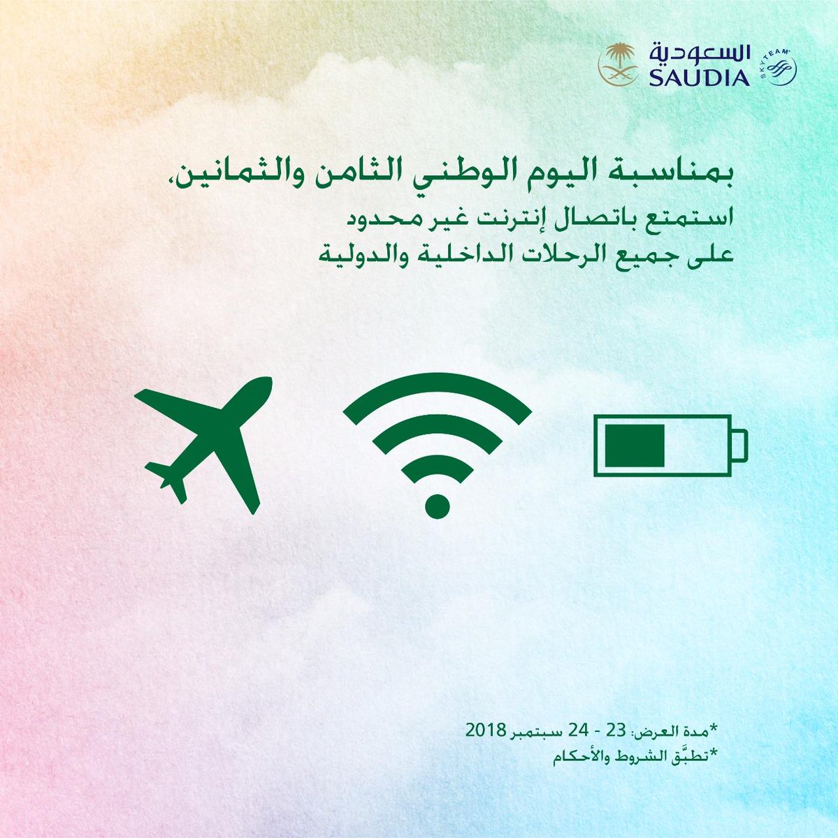 وتضمنت مشاركة “السعودية” في اليوم الوطني الثامن والثمانين الإعلان عن سعر مخفض ورمزي غير مسبوق لتذاكر السفر على متن رحلاتها الداخلية من خلال السفر من وإلى 27 مطاراً داخل المملكة بدءً من (88) ريالاً للوجهة الواحدة على درجة الضيافة ، كما أن عملية بيع التذاكر بالتخفيض المعتمد للرحلات الداخلية ستتم من خلال جميع القنوات البيعية يومي 22 و 23 سبتمبر 2018م على أن تكون فترة السفر بين 7 أكتوبر وحتى 20 ديسمبر من نفس العام .