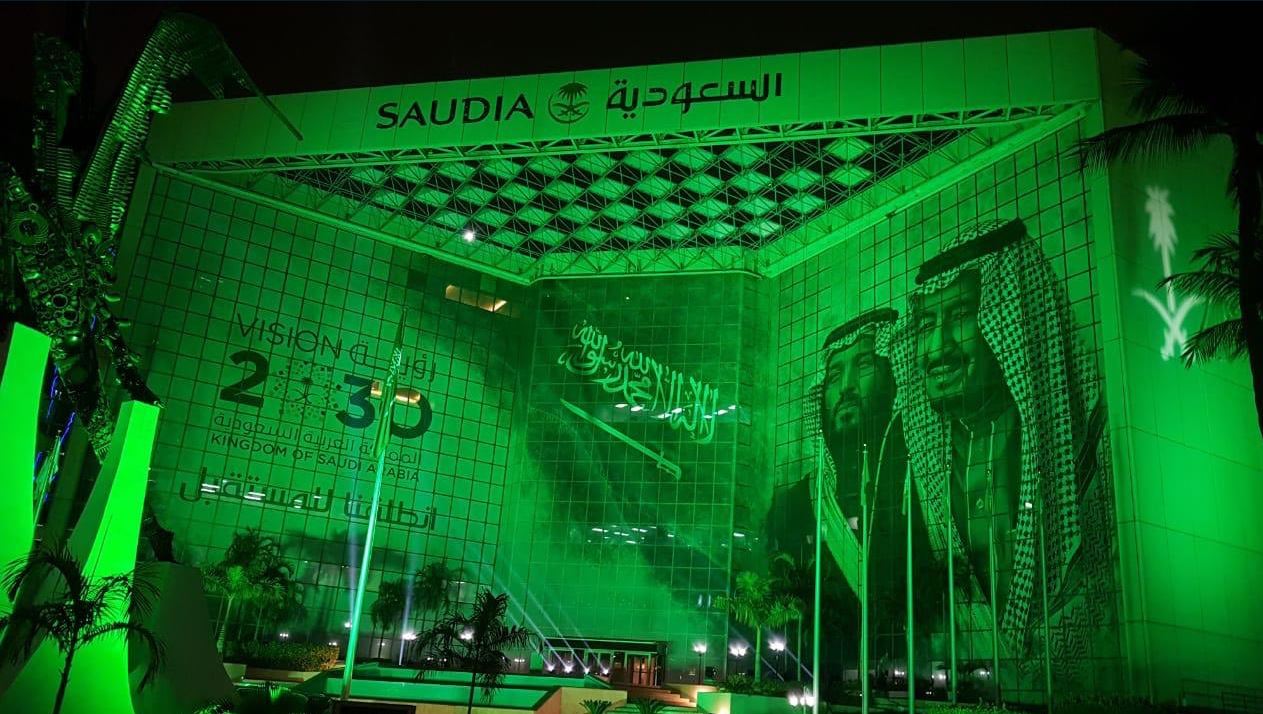 واكتسى المبنى الرئيسي للإدارة العامة للخطوط السعودية الواقع في الجهة الغربية من مدينة “السعودية” بالخالدية على طريق الملك عبدالعزيز بجدة حلة جديدة وتوشح المبنى بصورة خادم الحرمين الشريفين وسمو ولي عهده الامين وشعار رؤية المملكة 2030 مع عبارة “انطلقنا إلى المستقبل” فيما رفرت راية التوحيد على كامل أسوار مدينة “السعودية” .