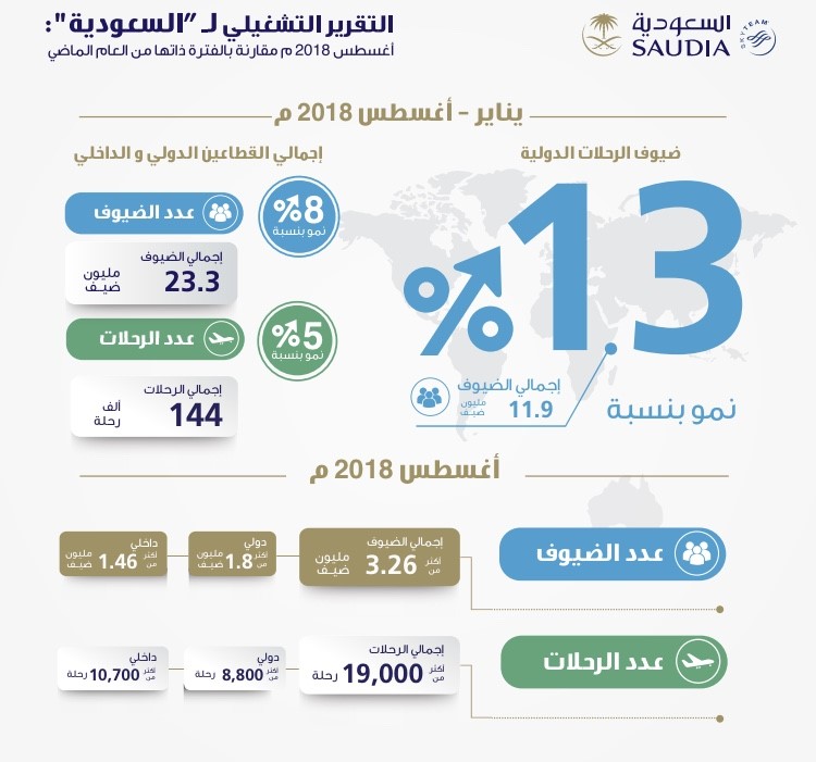 واصلت الخطوط السعودية تحقيق معدلات تشغيلية متميزة خلال شهر أغسطس الماضي حيث بلغ عدد الضيوف المنقولين على كافة رحلاتها في القطاعين الداخلي والدولي أكثر من (3,26) مليون ضيف بزيادة نسبتها (5%) مقارنة بنفس الفترة من العام الماضي، بينما بلغ إجمالي عدد الرحلات المجدولة والإضافية أكثر من (19) ألف رحلة بزيادة تصل إلى (5%) ، وبذلك يتجاوز إجمالي أعداد الضيوف منذ بداية العام حتى نهاية شهر أغسطس (23,3) مليون ضيف بنمو نسبته (8%) مقارنة بالفترة ذاتها من العام الماضي، وتجاوز عدد الرحلات التي تم تشغيلها (144,4) ألف رحلة بزيادة نسبتها (5%) .