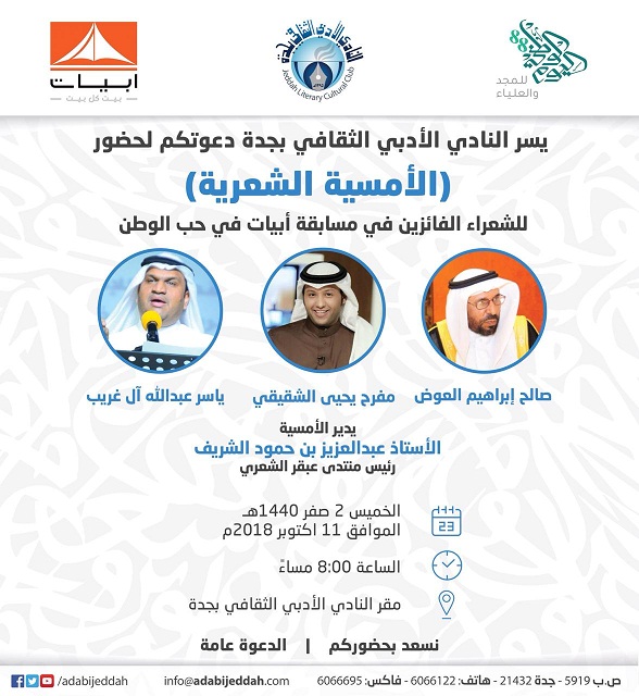يقيم النادي الأدبي الثقافي بجدة غدا الخميس، أمسية شعرية يستضيف فيها الشعراء الفائزين في مسابقة أبيات في حب الوطن وهم الشاعر صالح ابراهيم العوض والشاعر مفرح الشقيقي والشاعر ياسر عبدالله ال غريب. ويدير الأمسية الشاعر والإعلامي عبدالعزيز بن حمود الشريف رئيس منتدى عبقر الشعري.
