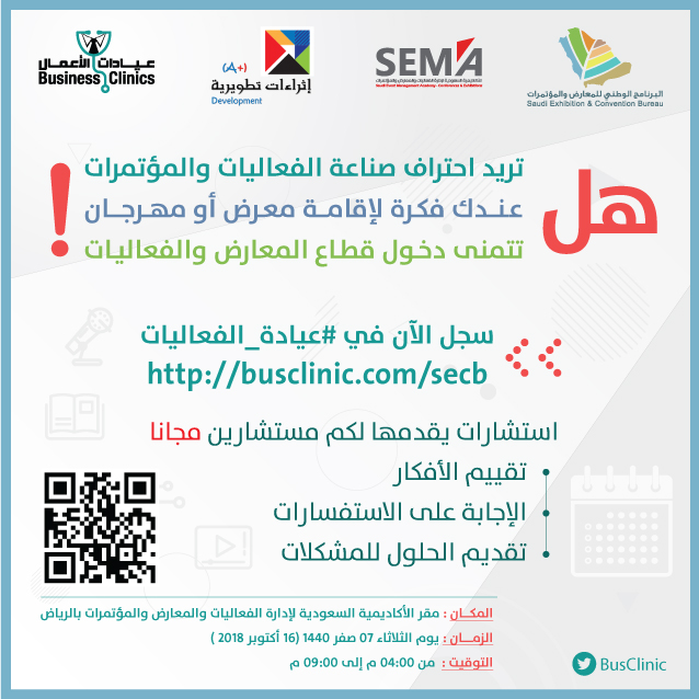 وللراغبين بالاستشارة في عيادات الأعمال والاستفادة من الخبراء والمستشارين يمكن التسجيل في عيادة الفعاليات عبر الرابط التالي: https://busclinic.com/secb.