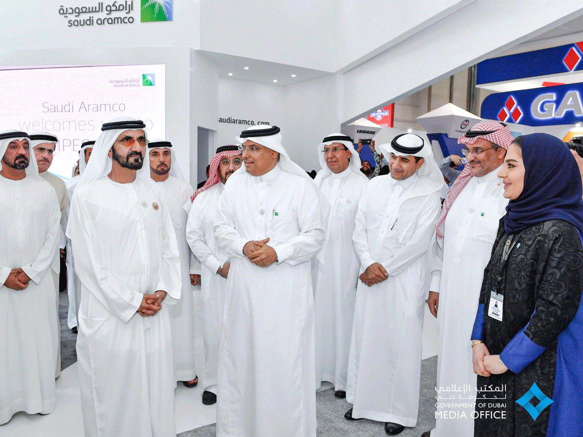 وكانت المحطة الأولى التي توقف عندها صاحب السمو نائب رئيس الدولة رئيس مجلس الوزراء حاكم دبي جناح شركة “أرامكو” السعودية الأكبر مساحة والأكثر اهتماما من قبل الزوار والشركات المتخصصة ذات العلاقة بالصناعة النفطية وتقنياتها، واستمع سموه من المسؤولين السعوديين في الجناح الى شرح حول الإمكانات التقنية والفنية والطاقات البشرية المتوفرة في “أرامكو” ما يجعلها من أكبر الشركات في العالم من حيث الصناعة البتروكيماوية واستخراج وادارة آبار النفط في المملكة العربية السعودية الشقيقة والمشاريع الاستثمارية الكبرى التي تقوم بها داخل المملكة وخارجها ناهيك عن عمليات التنقيب التي تتولى القيام بها في الأراضي السعودية والإنتاج والتكرير والتوزيع والشحن والتسويق لمنتجاتها من الموارد الهيدروكربونية.