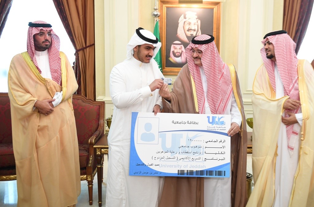كما منح سموه أول بطاقات جامعية للمسجلين في هذا البرنامج من الطلاب والطالبات المتفوقين بالصف الثالث ثانوي .