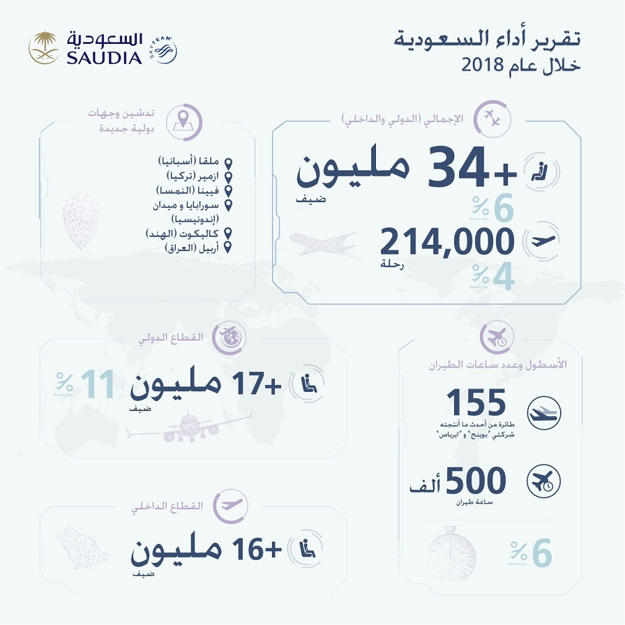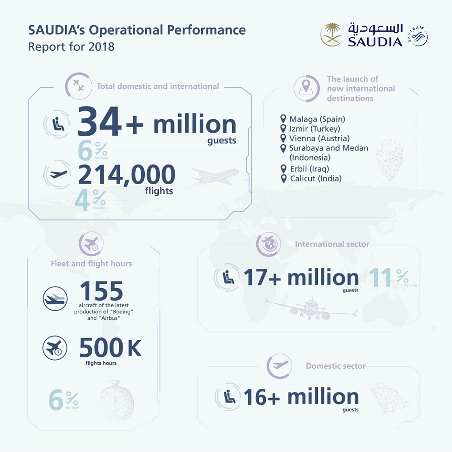 حققت الخطوط السعودية خلال عام 2018م أرقاما قياسية جديدة وأداءً مميزا لعملياتها التشغيلية على شبكة رحلاتها الدولية المتنامية، ونجحت في تحقيق قفزة كبيرة بنسبة تزيد عن (11%) في أعداد الضيوف المنقولين دوليا مقارنة بالعام السابق، لتواصل بذلك النمو الكبير والتوسع في التشغيل الدولي عبر تدشين وجهات دولية جديدة وزيادة الرحلات والسعة المقعدية إلى الوجهات التي تشهد اقبالا على السفر وفق خطط تسويقية وتشغيلية ولأول مرة في تاريخ “السعودية” منذ تأسيسها تجاوز عدد الضيوف على الرحلات الدولية عدد ضيوف القطاع الداخلي وهو ما يعكس توجه الناقل الوطني للتوسع في التشغيل الدولي وتعزيز مكانته بين شركات الطيران العالمية وزيادة حصته في سوق النقل الدولي، حيث أبان تقرير الأداء التشغيلي لشركة الخطوط السعودية للنقل الجوي للعام المنصرم نقل أكثر من (17) مليون ضيف على القطاع الدولي من إجمالي عدد الضيوف الذين تم نقلهم خلال عام (2018م) والذي تجاوز (34) مليون ضيف، مواصلا بذلك النمو المتواصل وبنسبة كبيرة تبلغ ضعف معدل النمو العالمي في حركة النقل الجوي والذي يتراوح بين 5 و 6% .