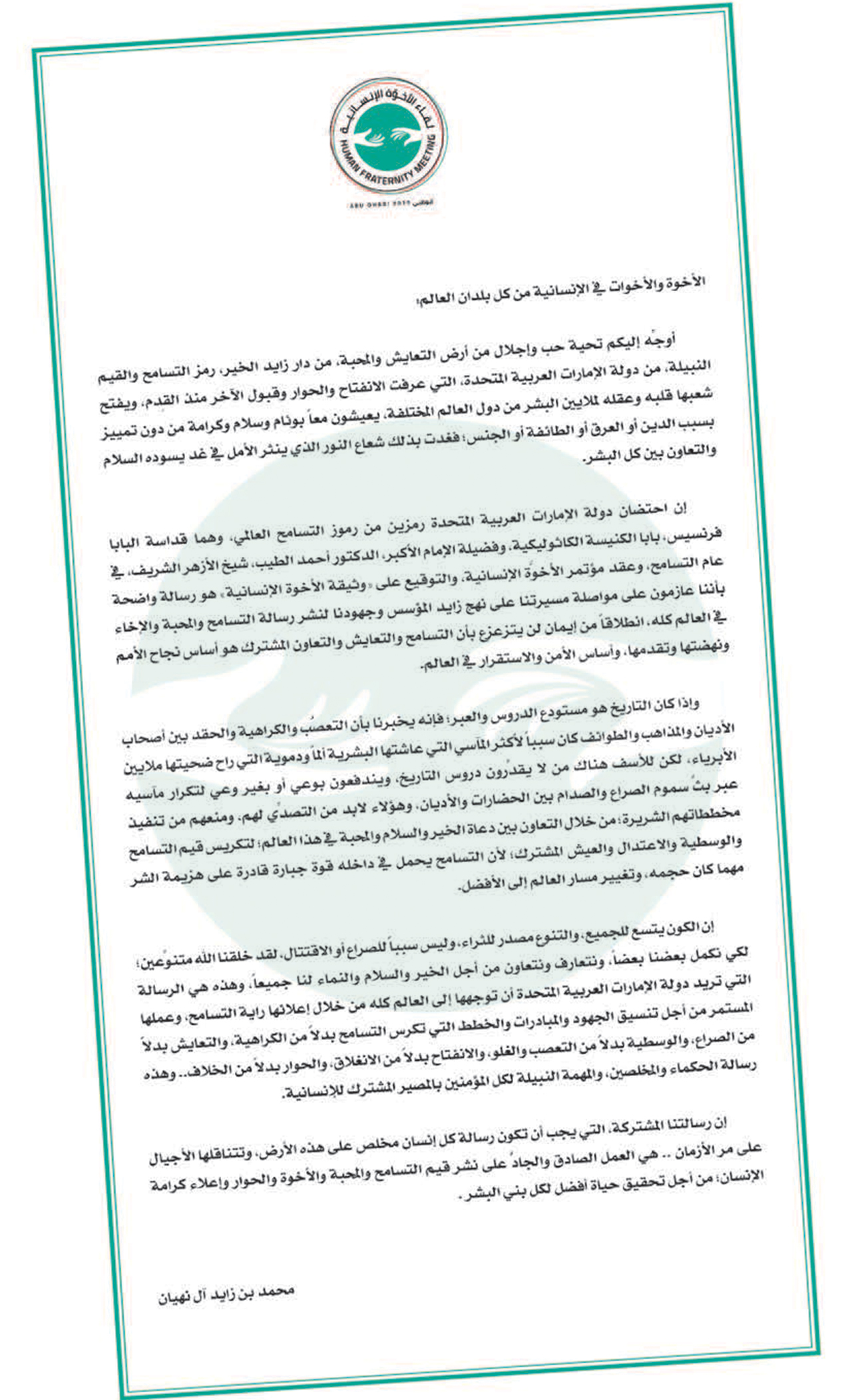 «الأخوة والأخوات في الإنسانية من كل بلدان العالم: أوجِّه إليكم تحية حب وإجلال من أرض التعايش والمحبة، من دار زايد الخير، رمز التسامح والقيم النبيلة، من دولة الإمارات العربية المتحدة، التي عرفت الانفتاح والحوار وقبول الآخر منذ القِدم، ويفتح شعبها قلبه وعقله لملايين البشر من دول العالم المختلفة، يعيشون معاً بوئام وسلام وكرامة، من دون تمييز بسبب الدين أو العرق أو الطائفة أو الجنس؛ فغدت بذلك شعاع النور الذي ينثر الأمل في غد يسوده السلام والتعاون بين كل البشر.