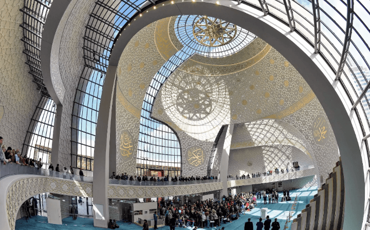 تبلغ مساحة هذا المسجد 4500 متر مربَّع، وهو يتسع لنحو 4000 مصلّ، ومُصمَّم وفق الطراز العثماني، ويمتاز بتفاعل واضح بين الزجاج والخرسانة والخشب، ويضمُّ غرف الصلاة ومكتبة وقاعات للدورات التدريبية، فضلًا عن الحلقات الدراسية. قبَّة المسجد شفَّافة، وتعلوه مئذنتان بطول 55 مترًا لكلٍّ منها.