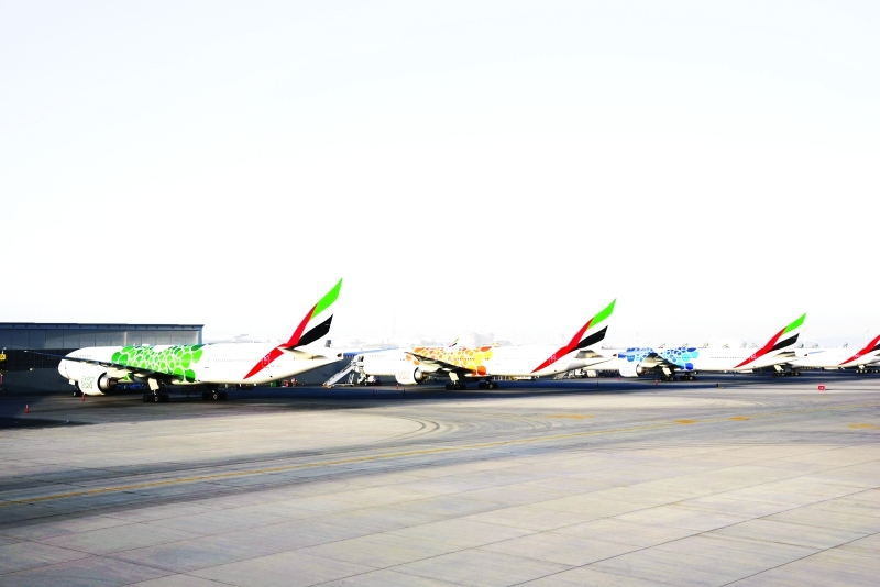 وكانت طيران الإمارات قد كشفت النقاب في عام 2017 عن ملصق ضخم لمعرض إكسبو 2020 دبي على إحدى طائراتها البوينج 777-300ER باللون الأزرق، الذي يرمز لموضوع «التنقل».