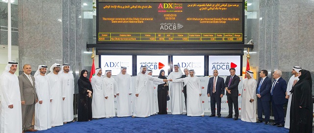 وبدأ تداول أسهم المجموعة المصرفية الجديدة في احتفال رسمي أقيم في سوق أبوظبي للأوراق المالية، بقرع جرس افتتاح التداول، بحضور عدد من أعضاء الإدارة التنفيذية من بنك أبوظبي التجاري وبنك الاتحاد الوطني ومصرف الهلال والإدارة العليا لسوق أبوظبي للأوراق المالية.