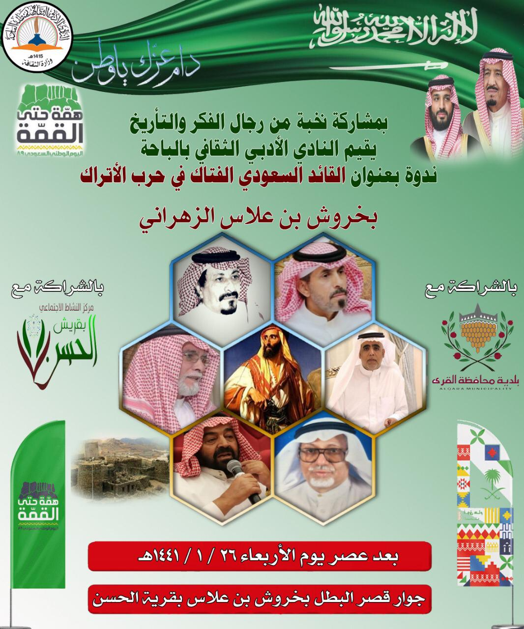 ضمن نشاطات نادي الباحة الأدبي الثقافي بذكرى اليوم الوطني المجيد 89 (همة حتى القمة) يقيم النادي ندوة بعنوان القائد السعودي الفتاك في حرب الأتراك بخروش بن علاس الزهراني بعد عصر يوم الأربعاء 26 محرم وسيشارك في الندوة نخبة من أدباء ومؤرخي المنطقة: علي سدران سعد الكاموخ محمد زياد محمد العسعوس محمد جبران يديرها الإعلامي القدير علي بن يحيى أبو القرون نائب رئيس تحرير جريدةالمدينة وسيتحدث المشاركون عن بطولاته في صد المعتدين الاتراك عن وطننا الغالي والهزائم التى ألحقها بهم والكثير من جوانب حياته