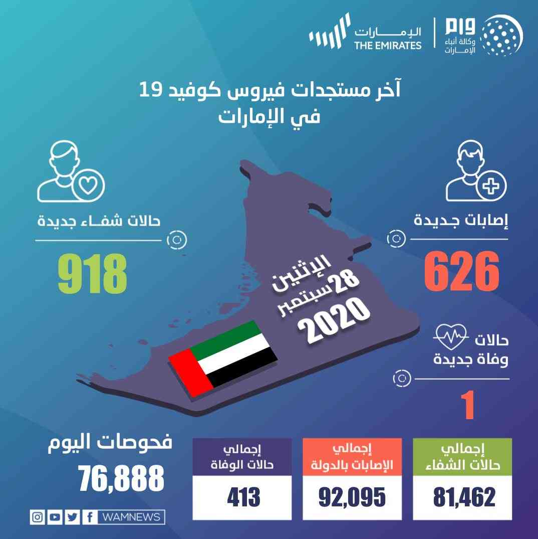 وساهم تكثيف إجراءات التقصي والفحص في الدولة وتوسيع نطاق الفحوصات على مستوى الدولة في الكشف عن 626 حالة إصابة جديدة بفيروس كورونا المستجد من جنسيات مختلفة، وجميعها حالات مستقرة وتخضع للرعاية الصحية اللازمة، وبذلك يبلغ مجموع الحالات المسجلة 92,095 حالة.