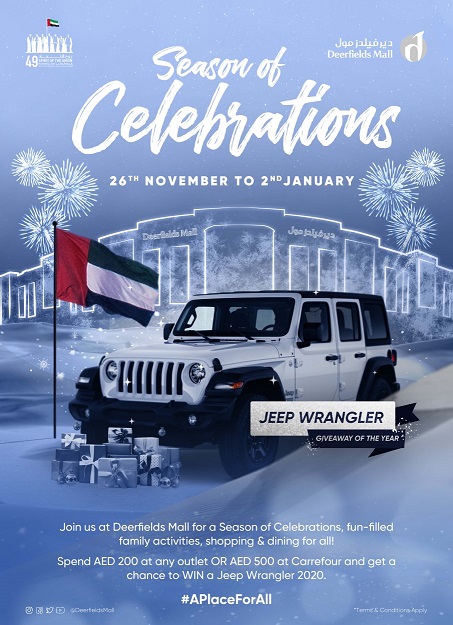 وقالت إدارة المركز للزوار: ” أنفقوا واربحوا بداية من 26 نوفمبر 2020 وحتى 2 يناير 2021! تعرّفوا على العروض الرائعة المتوفّرة في جميع منافذ البيع في كافة أنحاء مركز ديرفيلدز مول التجاري، قوموا بشراء القطع التي تحلمون بها، واحصلوا على فرصة للفوز بسيارة جيب رانجلر 2020 الجديدة إضافة إلى إحدى الجوائز الفورية البالغ عددها 5,000 مع عرض “أنفق واربح”، حيث سيتمكّن العملاء من خلال إنفاق 200 درهم في أي منفذ داخل المركز أو 500 درهم في كارفور، الحصول على أفضل رحلة والتمتّع بجولة في السيارة حول الإمارات لأخذ استراحة بعد الإغلاق الطويل”.