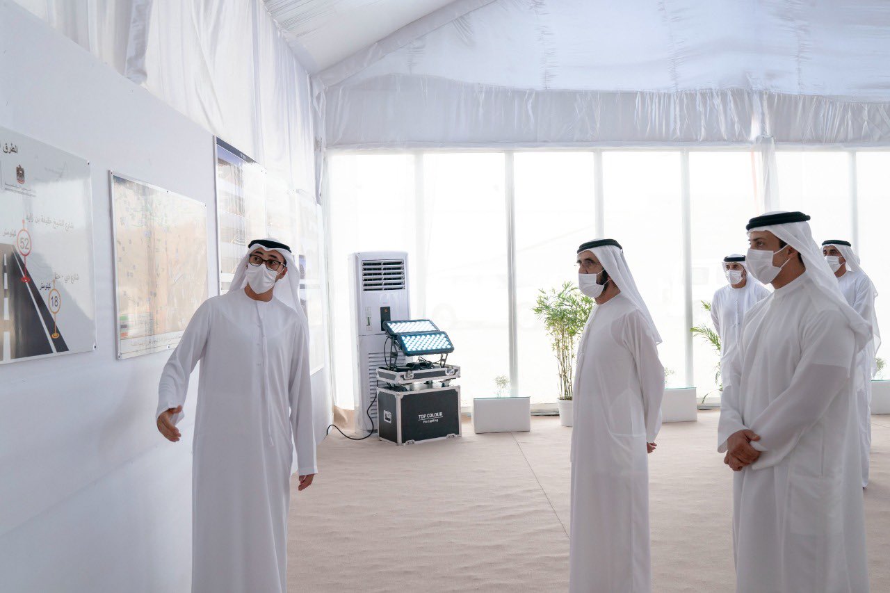 واستمع صاحب السمو الشيخ محمد بن راشد آل مكتوم، وإلى جانبه سمو الشيخ منصور بن زايد آل نهيان، إلى شرح من سعادة المهندس علي المزروعي، مدير إدارة المشاريع الهندسية في وزارة الشؤون الرئاسة، حول مشاريع الطرق الحيوية التي جرى تنفيذها بمتابعة سمو الشيخ منصور بن زايد آل نهيان، وأشرفت وزارة شؤون الرئاسة على تنفيذها بالتعاون والتنسيق مع وزارة الطاقة والبنية التحتية وشركة الاتحاد للماء والكهرباء، وتضم شبكة مسارات وطرق وتقاطعات وجسور في ثلاثة محاور رئيسية تشمل : طريق الشيخ خليفة بن زايد وطريق الوطن وطريق حتا دبي، وبأطوال إجمالية تصل إلى 112 كيلومترا.