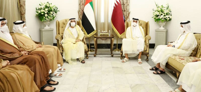 ونشر صاحب السمو الشيخ محمد بن راشد آل مكتوم عبر حسابه الرسمي في «تويتر»، صوراً خلال لقاء سموه أمير دولة قطر، وعلق سموه عليها قائلاً: «أثناء لقائي مع أخي صاحب السمو الشيخ تميم بن حمد آل ثاني أمير دولة قطر حفظه الله.. الأمير تميم شقيق وصديق.. والشعب القطري قرابة وصهر.. والمصير الخليجي واحد.. كان وسيبقى… حفظ الله شعوبنا وأدام أمنها واستقرارها ورخاءها». كما بحث صاحب السمو الشيخ محمد بن راشد آل مكتوم، مع الشيخ تميم بن حمد آل ثاني، تعزيز العلاقات الثنائية التي تخدم عملية البناء والتنمية والتقدم، وتحقيق المصالح المشتركة للبلدين الشقيقين.