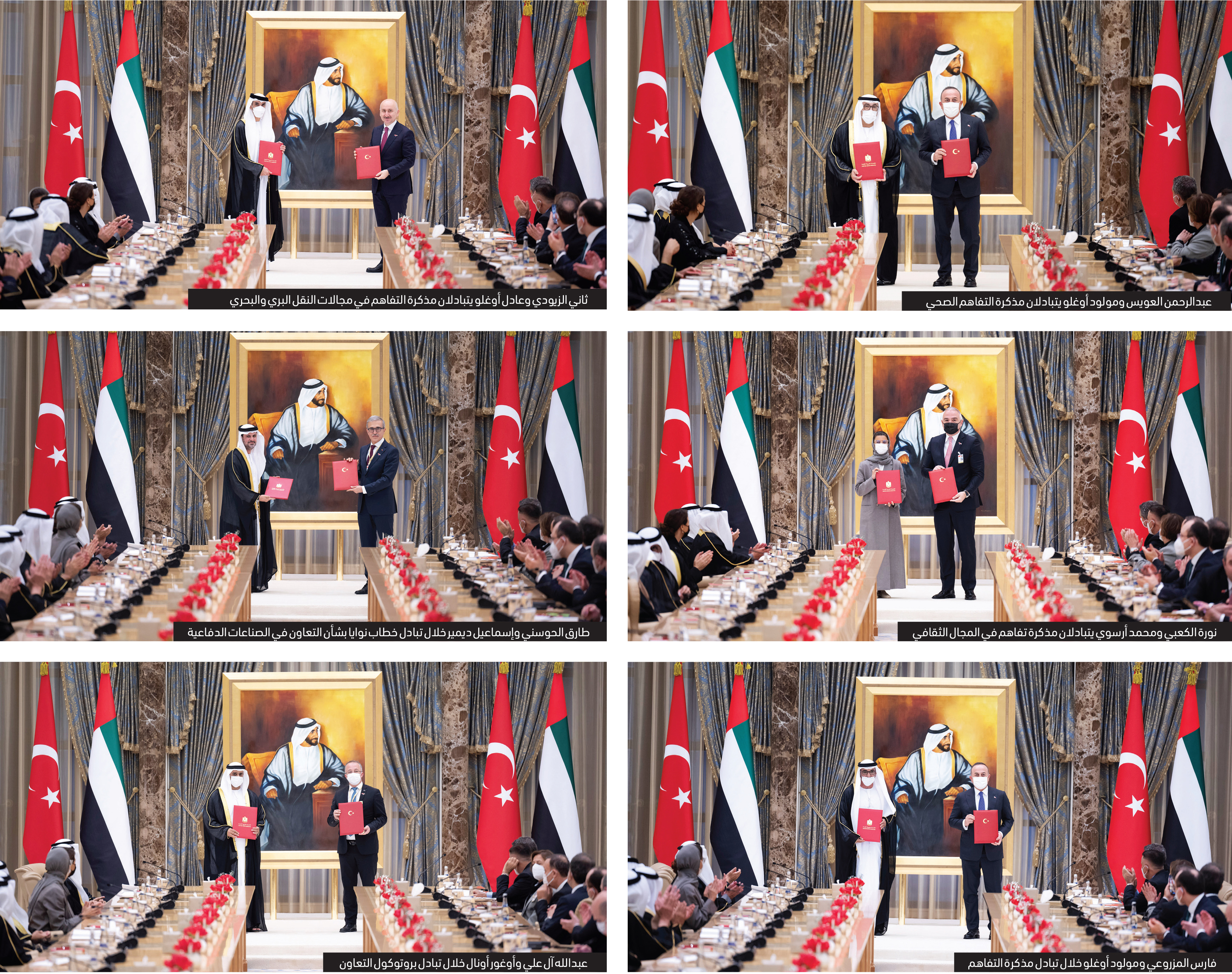 7 – مذكرة تفاهم في مجالات النقل البري والبحري بين حكومتي دولة الإمارات العربية المتحدة والجمهورية التركية تبادلها معالي الدكتور ثاني بن أحمد الزيودي وزير دولة للتجارة الخارجية وعادل قرايسمايل أوغلو وزير النقل والبنية التحتية.