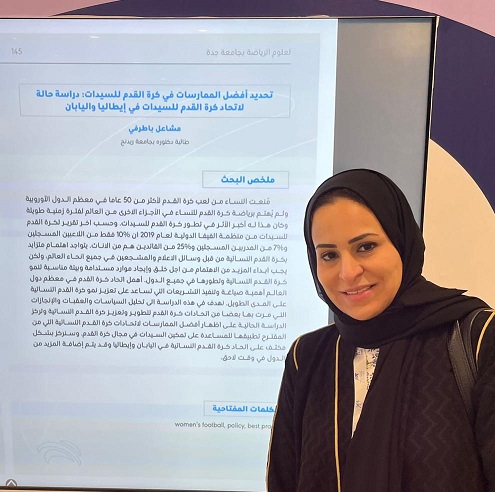 وعرضت باطرفي بحثها العلمي بعنوان “تحديد أفضل الممارسات في كرة القدم للسيدات، دراسة حالة لاتحاد كرة القدم للسيدات في ايطاليا واليابان”، وقدمت خلال المؤتمر ورشة عمل عن “مهارات القيادة للسيدات” في المجال الرياضي، تحدثت خلالها عن السبل الكفيلة بتمكين المرأة السعودية في المجال الرياضي.