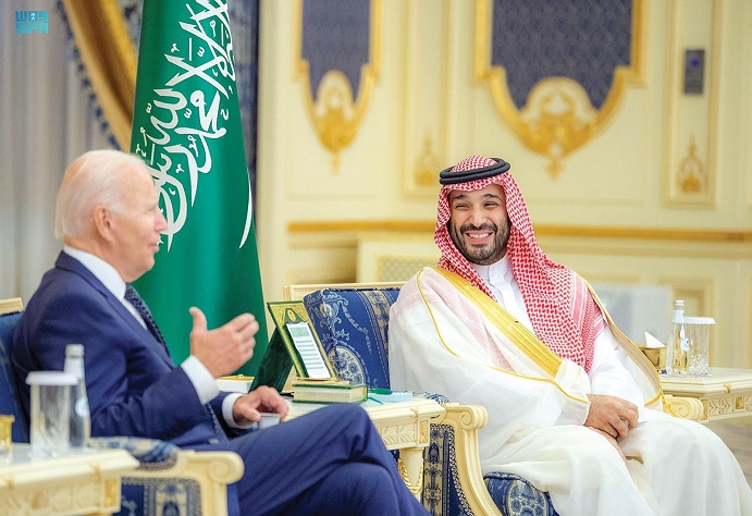 عقد صاحب السمو الملكي الأمير محمد بن سلمان بن عبدالعزيز ولي العهد نائب رئيس مجلس الوزراء، وفخامة الرئيس جوزيف بايدن رئيس الولايات المتحدة الأميركية، في قصر السلام بجدة، أمس، جلسة مباحثات رسمية.