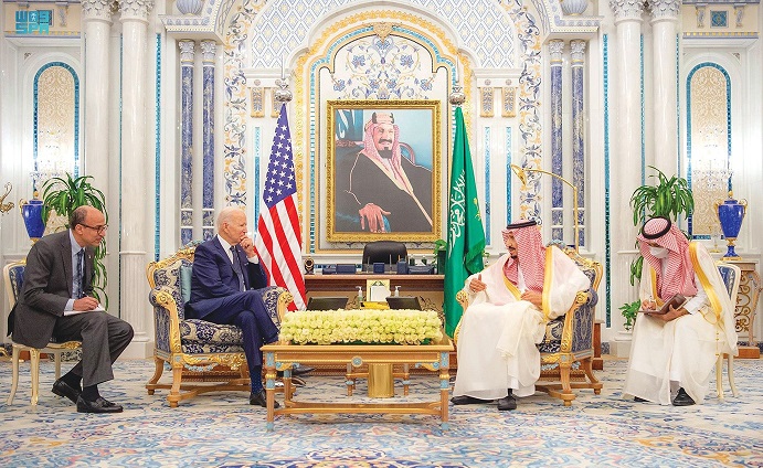 التقى خادم الحرمين الشريفين الملك سلمان بن عبدالعزيز آل سعود -حفظه الله-، بحضور صاحب السمو الملكي الأمير محمد بن سلمان بن عبدالعزيز ولي العهد نائب رئيس مجلس الوزراء، في قصر السلام بجدة، أمس، فخامة الرئيس جوزيف بايدن رئيس الولايات المتحدة الأميركية.