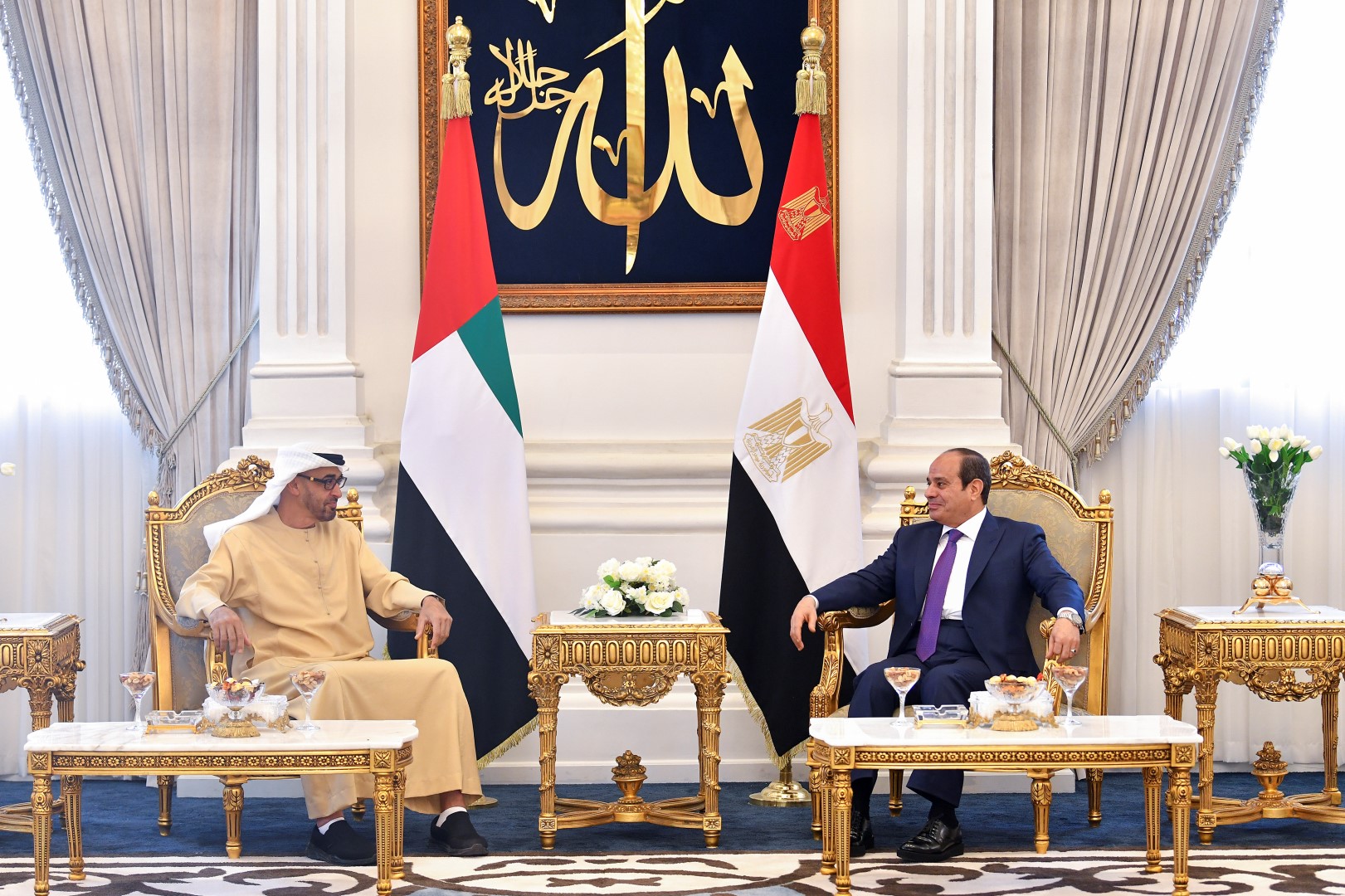 ورحب فخامة الرئيس المصري – خلال استراحة قصيرة في قاعة كبار الزوار في المطار – بصاحب السمو الشيخ محمد بن زايد آل نهيان وتبادلا الأحاديث الودية التي تعبر عن عمق العلاقات الأخوية التي تجمع البلدين وشعبيهما الشقيقين.