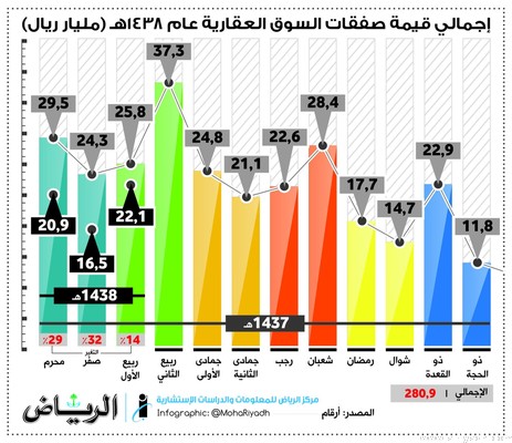 وبذلك تصل قيمة الصفقات العقارية منذ بداية العام 1438 هـ إلى 59.5 مليار ريال، مقارنة مع 79.6 مليار ريال بنسبة انخفاض تبلغ 25%.