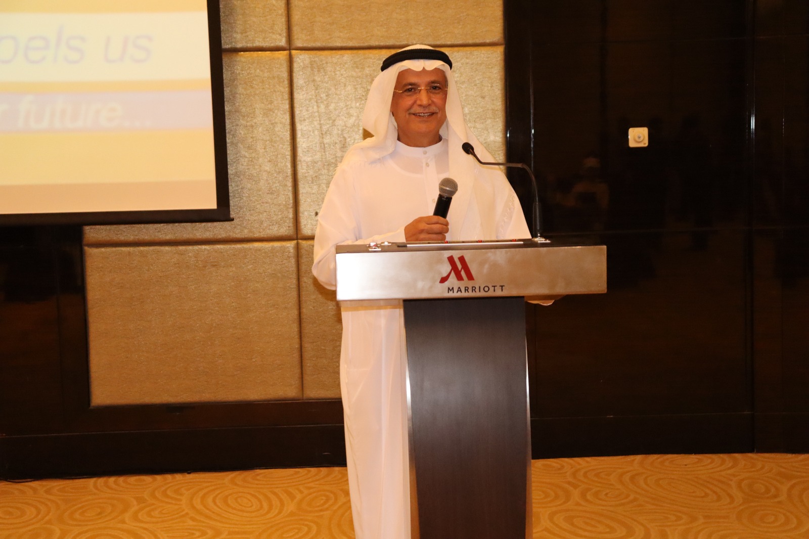أكد الدكتور علي سعيد العامري رئيس مجلس إدارة مجموعة الشموخ – في كلمته – أن دولة الإمارات تمضي برؤية واضحة نحو المستقبل بفضل توجيهات القيادة الرشيدة وإطلاقها لمجموعة من المبادرات الوطنية تستهدف الانطلاق إلى المستقبل من خلال اقتصاد وطني قوي، مشيراً إلى وجود مبادرات لمضاعفة إعادة التصدير بنسبة 100% خلال السنوات السبع القادمة، مع الاستفادة من 50 مكتباً تجارياً منتشرة حول العالم. وأشار إلى أن دولة الإمارات تمكنت من خلق بيئة أعمال جاذبة للشركات والمؤسسات العالمية، كما حرصت الدولة على تعزيز مكانتها وريادتها على الخارطة العالمية في قطاع الطاقة وخاصة الطاقة النظيفة والمتجددة، مؤكداً أن الإمارات أصبحت إحدى أهم الوجهات الاقتصادية العالمية، وقد نجحت في وقت قياسي من جذب أكبر الشركات العالمية.