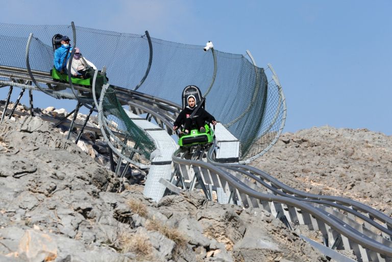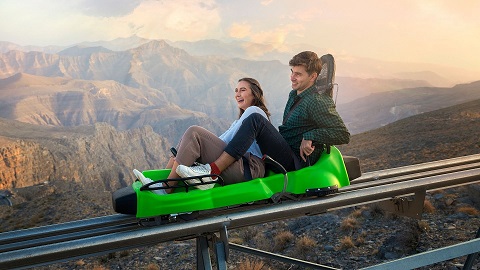 أعلى قمة جبلية في راس الخيمة في دولة الامارات مغامرة جديدة، تُعرف باسم “جيس سليدر”، وهي عبارة عن زلاجة تسير على مسار فولاذي بسرعة 40 كيلومترًا بالساعة (شاهد مقطع الفيديو أعلاه).